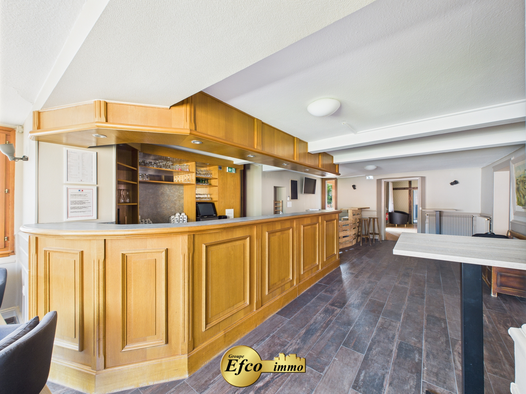 Au rez-de-chaussée surélevé : Un restaurant chaleureux comprenant un hall d'entrée, un espace bar avec petit salon, une salle de restauration entièrement rénovée, une grande cuisine professionnelle équipée, ainsi que des sanitaires séparés pour hommes, femmes et personnes à mobilité réduite. Un bureau et un espace de repos avec salle de bain complètent cet espace.