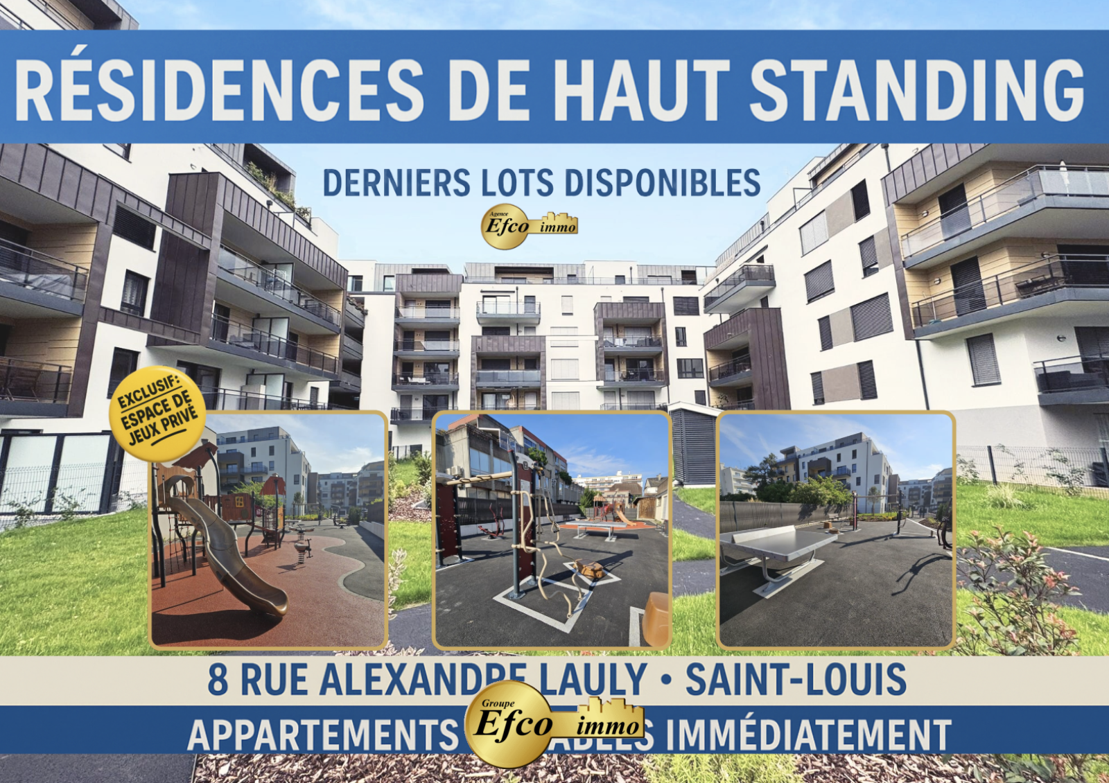 Situé à proximité de l’EuroAirport, de l’autoroute A35 et aux portes de la Suisse ; la ville de Saint-Louis se place idéalement au cœur des trois frontières. Sa gare ainsi que son réseau de bus et tram vous emmènent au centre-ville de Bâle en quelques minutes. A deux pas d’un des plus beaux marchés de France, profitez du confort et de l’innovation de nos prestations de qualité : Portes fenêtres coulissantes avec brises soleil orientables motorisés, domotique, planchers chauffant avec thermostat dans chaque pièce, cuisine équipée avec électroménager de grande marque, porte de garage motorisée, …
