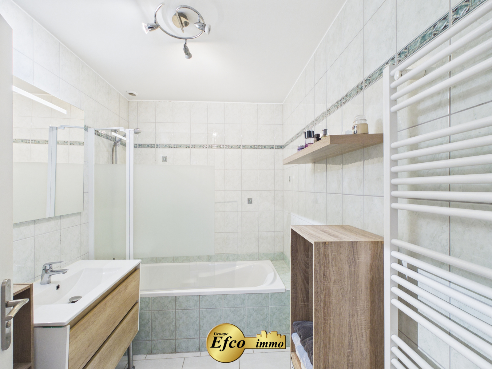 Un couloir déssert l'epace nuit composé de 3 chambres à coucher ainsi que d'une salle de bain équipée d'une baignoire/douche, d'un meuble grande vasque, d'un sèche serviette et des toilettes séparées.